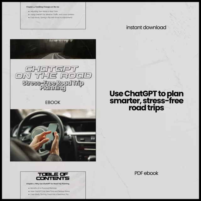 Turn your next adventure into a smooth, unforgettable journey with ChatGPT on the Road: Stress-Free Road Trip Planning. This powerful, easy-to-follow eBook shows you exactly how to use chatgpt for road trip planning so you can skip the overwhelm and focus on the fun. Whether you’re mapping out a weekend getaway or a cross-country escape, this guide transforms scattered ideas into a clear, flexible, and enjoyable travel plan using AI.